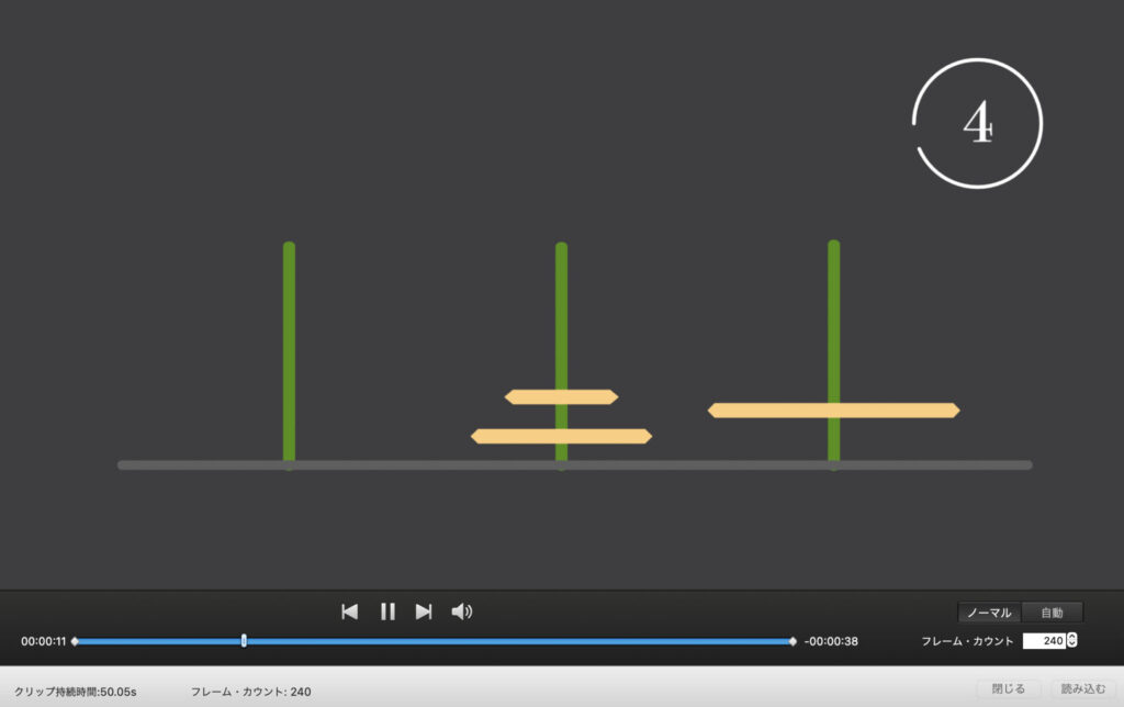 すると、動画ファイルが開きますので、フレームカウントを指定して読み込みます。パラパラ漫画と同じ原理なので、フレームカウントが少ないと動作がカクカクとなります。どのくらいのフレーム数が必要かは動画によって違うと思いますので、何回か試してみましょう。