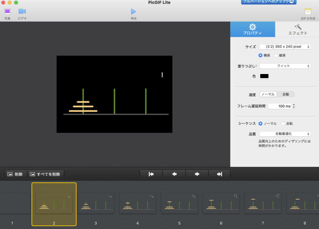読み込んだら、フレームを確認します。後ろの方に空のフレームが大量に残る場合がありますので、そのままだと何もない画像がずーっと流れるだけになってしまいますので、一枚一枚削除していきます。終わったら、GIFの作成ボタンを押すだけです。