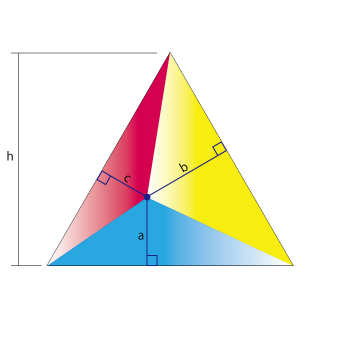 正三角形の内部に点を置き、各辺からその点までの最短距離を合計すると、その合計値(a+b+c)は、三角形の高さ(h)と一致します。 h = a + b + c 三角形の面積は、「底辺×高さ÷2」です。正三角形の場合、底辺はすべて共通なので、赤、青、黄色の三角形の... -