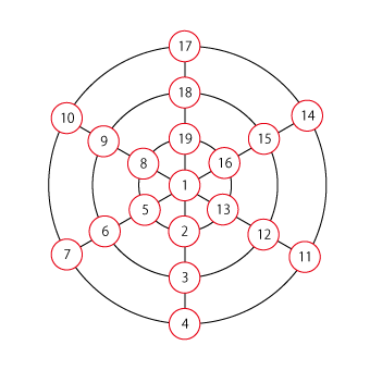 和算で有名な、関孝和の円陣です。 これは、特殊な魔方陣です。 魔方陣を見ていると、数の不思議に引き込まれてしまいます。 3つの軸の合計は、すべて同じになります。 17+18+19+1+2+3+4 = 6414+15+16+1+5+6+7 = 6411+12+13+1+8+9+10 = 64 3つの円周の合計... -