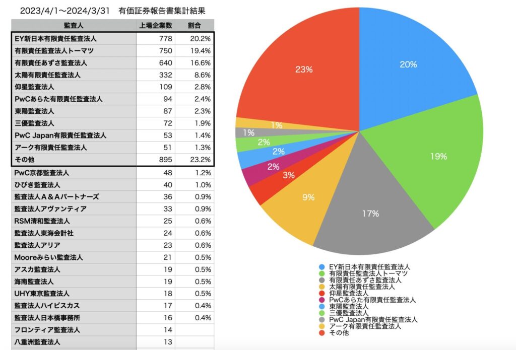 EDINET APIを使って、2023年4月1日から2024年3月31日に発行された全上場企業(約3900社)の有価証券報告書をダウンロードして、試しに監査法人のシェアをグラフにしてみました。
