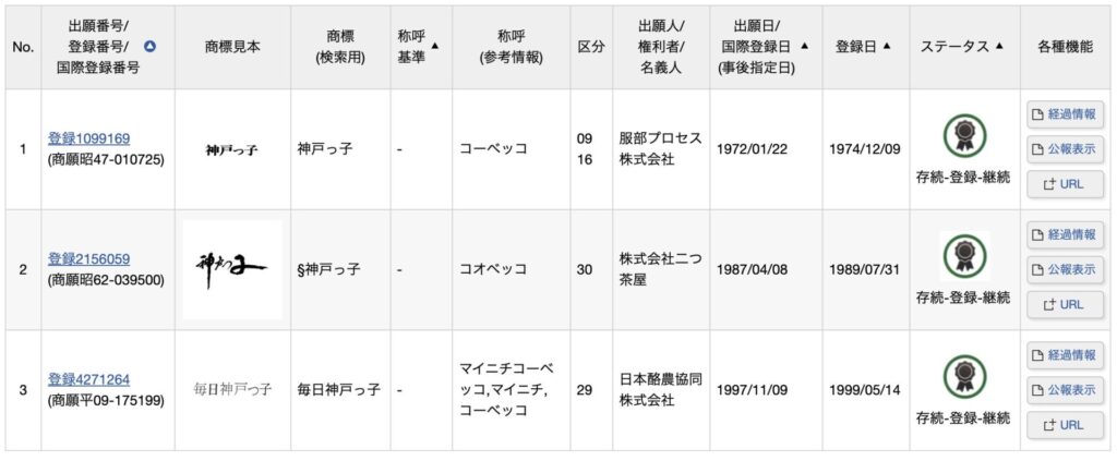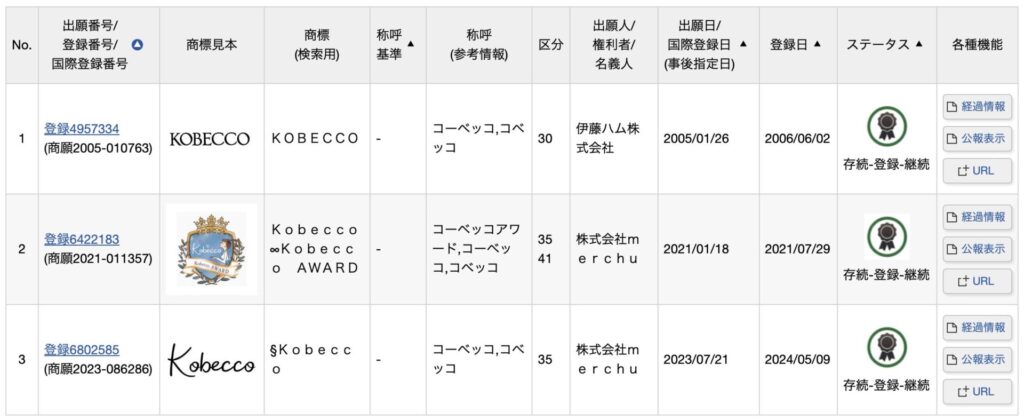 ちなみに、同じ名前というのは商標の世界ではよくあります。「KOBECCO」の商標を調べてみると、伊藤ハムも商標を取得しているようです。