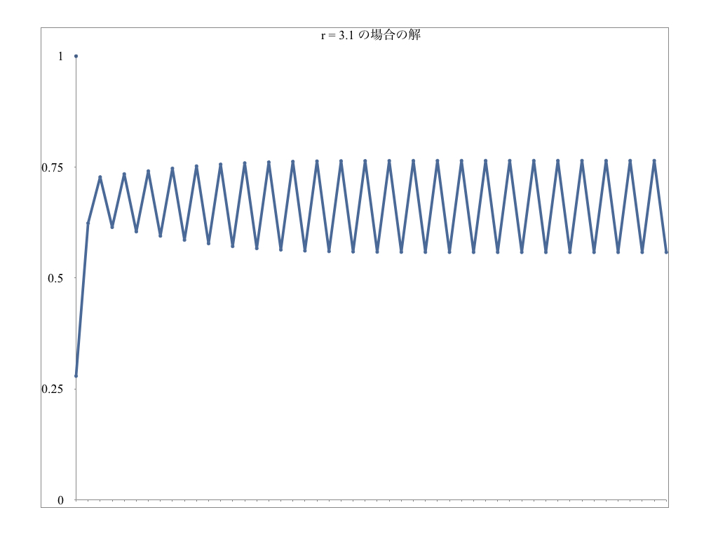 r=3.1の場合は、個体数が増えたり減ったりを繰り返します。食料が増えると個体数が増えますが、個体数が増えすぎると今度は食料難となったり環境が悪化することによって個体数が減ります。