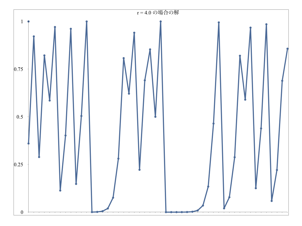 r=4.0の場合は、個体数の変動に規則性は見られず、もはや予測不能となります。