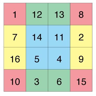 これは、縦、横、斜めの和がすべて34になる、4次魔方陣です。