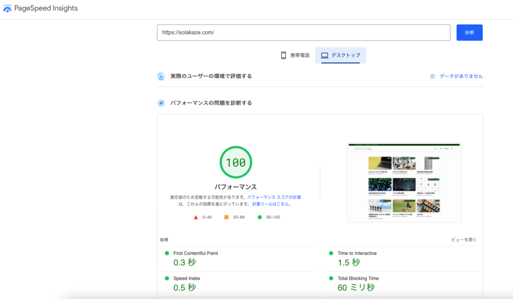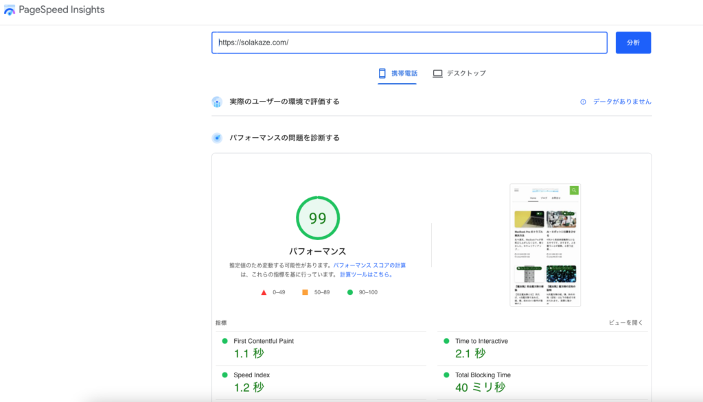 SWELLは、スピードも速く、SEOに強いと評判だったので、驚いてしまいました。Google Site Kitから、さらに詳細を調べるために、「Pagespeed Insights」に飛んでみると、いろいろと原因がわかってきました。