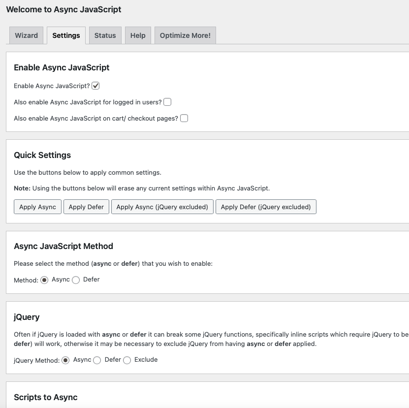 プラグインをインストールしたら、「ダッシュボード>設定>Async JavaScript」から、