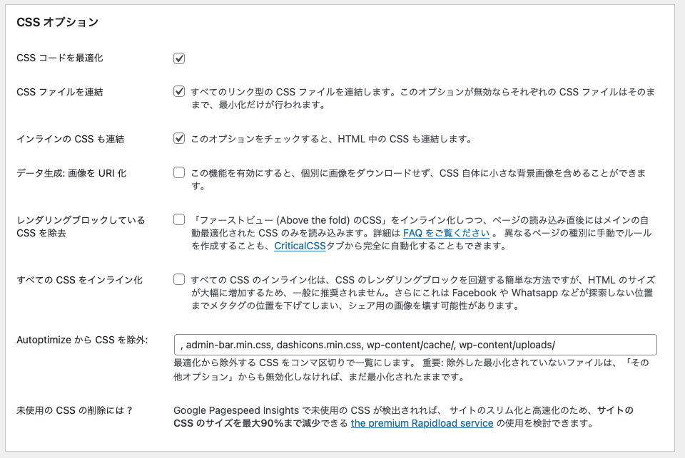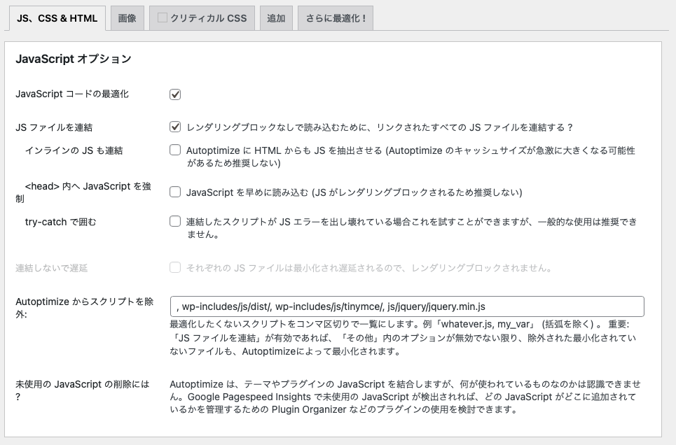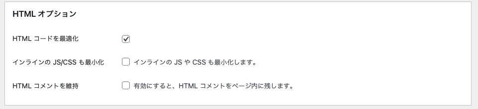 プラグインをインストールしたら、「ダッシュボード>設定>Autoptimize」から、「JavaScriptオプション」「CSSオプション」「HTMLオプション」を以下の通りに設定します。終わったら、一番下の「変更の保存とキャッシュの削除」ボタンを押して終了です。