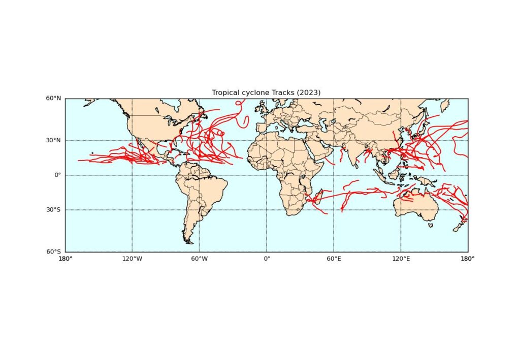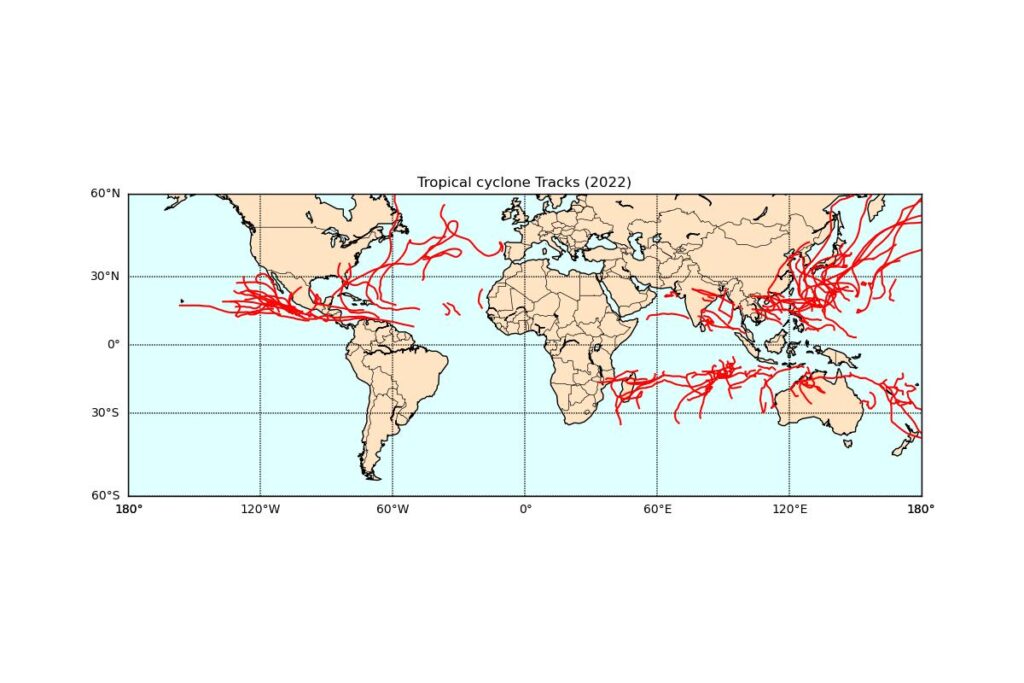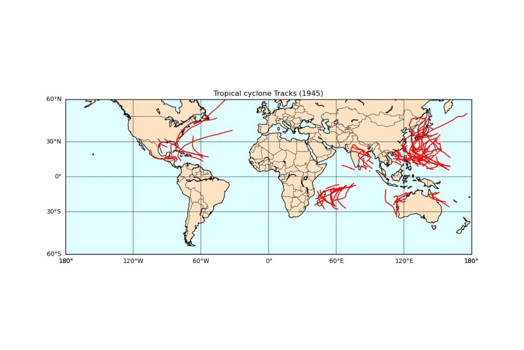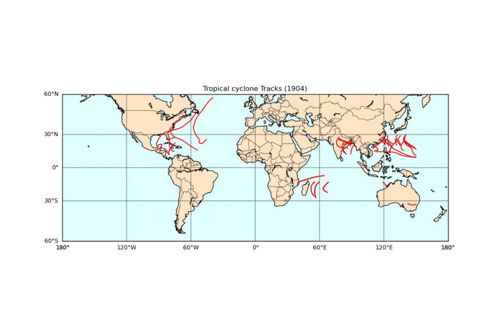 NOAA(National Centers for Environmental Information)のデータを使って、全世界で発生した熱帯低気圧の軌跡を年度別に描画しました。1842年からデータがありますが、初…