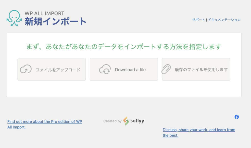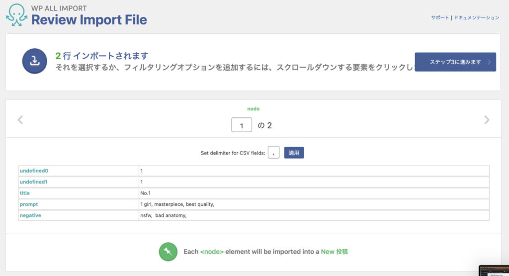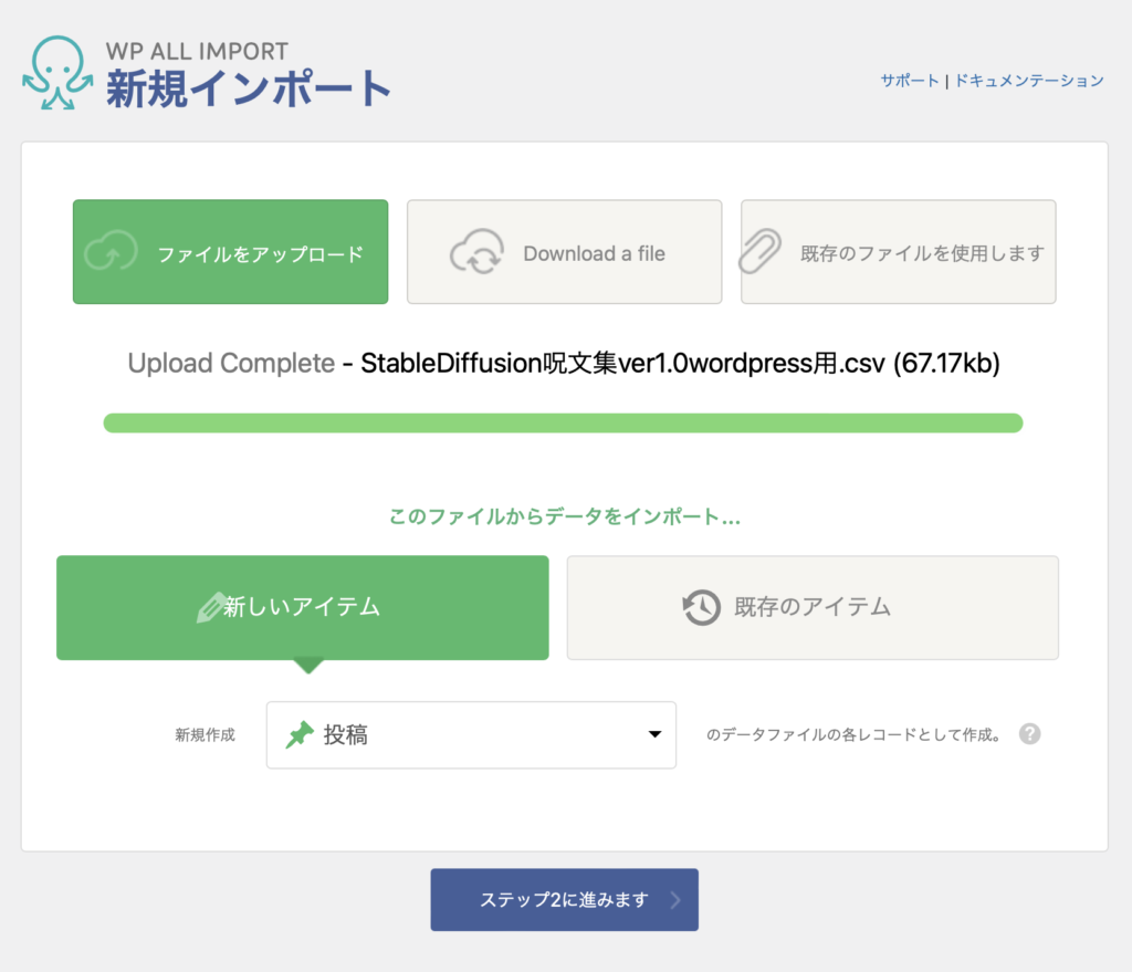 プラグインをインストールすると、左に「すべてインポート」→「New Import」をクリックすると、上記の画面が出てきます。ファイルをアップロードをクリックして、読み込みたいCSVファイルを選択します。