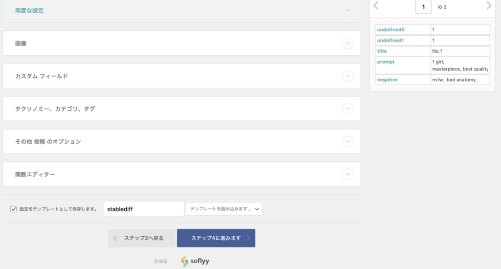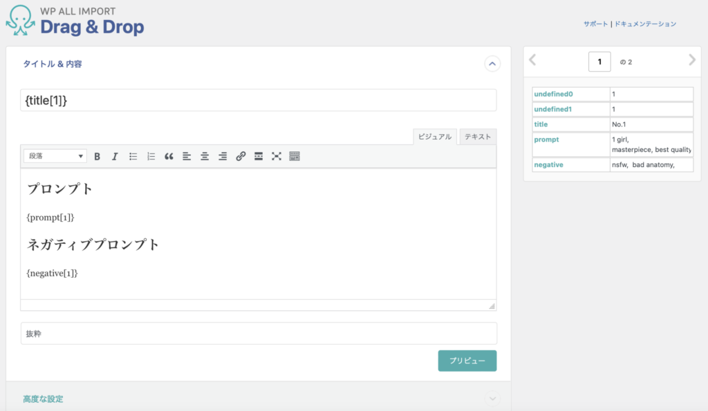 残念ながら、画像の自動取り込みは有料になってしまいます。しかし、わたしの場合、画像はアイキャッチ画像として追加しますので、これはあとから手動で入力してもそれほどの手間にはなりません。なので、無料のまま続行します。同じフォーマットのページを一度に大量に作る方がはるかに大変なので、それさえ自動でやってくれれば、かなりの手間が省けます。