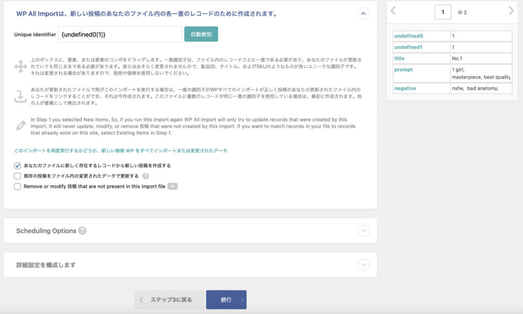 「自動検知」をクリックし、「 あなたのファイルに新しく存在するレコードから新しい投稿を作成する」にチェックを入れて、「続行」をクリックします。