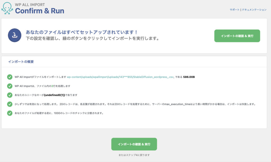 「インポートの確認&実行」ボタンをクリックすれば終わりです。