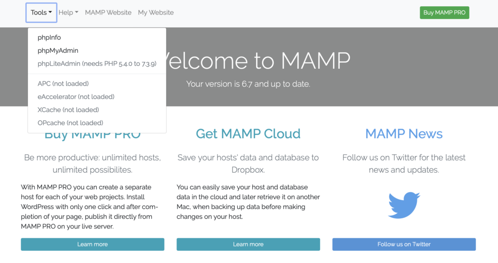 MAMP画面のWebStartボタンを押すと、Webが立ち上がります。Toolsを開き、phpMyAdminをクリックするとデータベースの画面に移ります。