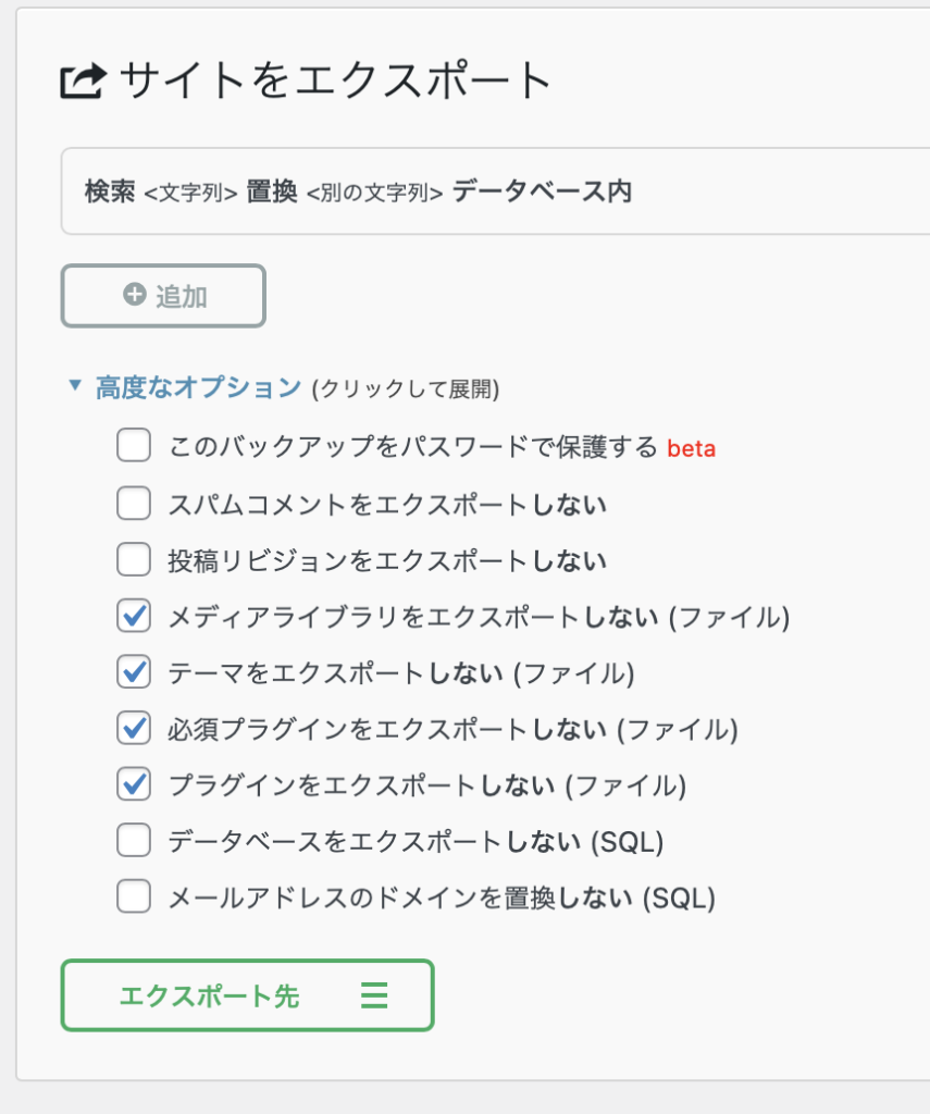 これは、必要なファイルを丸ごとバックアップできるプラグインです。これを使ってもミラーサイトを復元できるのですが、この場合、MAMP上でいちいち自分でMySQLデータベースを手動で設定し直さないといけないので、手間がかかります。All-in-One WP Migrationはその設定変更を自動でやってくれるので、データベースの設定については、All-in-One WP Migrationに任せることにします。しかし、ファイルサイズの問題から、アップロードした画像やテーマ、プラグインといったデータ量が大きくなるファイルは除外しています。その除外したファイルをBackWPupを使って移します。
