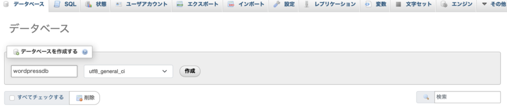 作りたいデータベース名を入れて、作成ボタンを押すと、データベースの箱が出来上がります。作業はこれだけです。