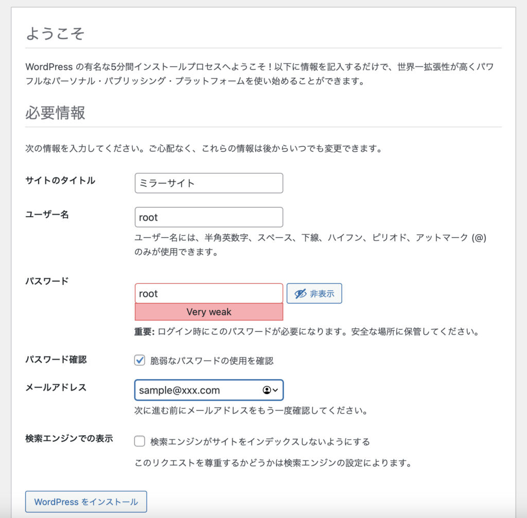 サイトのタイトル、ユーザー名、パスワード、メールアドレスを入れます。なお、この初期設定は今回だけで、データをインポートすると使えなくなります。(わたしはこれでハマりました。)