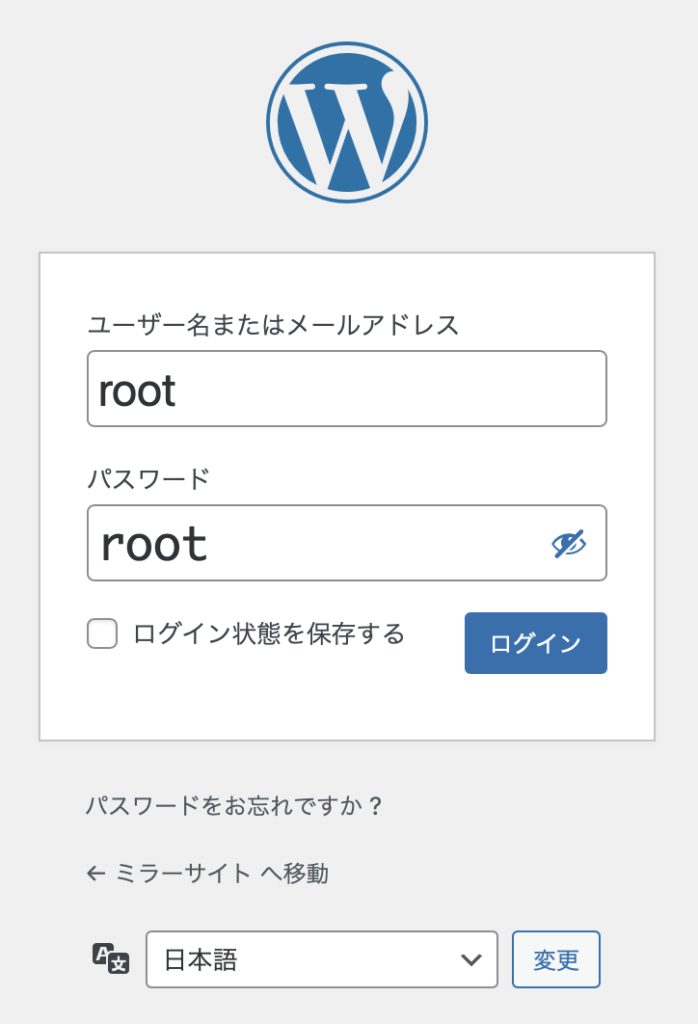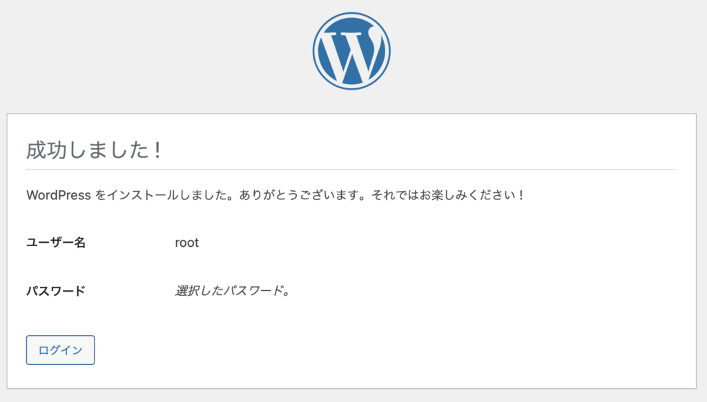 ここからが注意点なのですが、いったんログイン画面になりますが、ここで、初期インストール時に設定したログイン名、パスワードを入力してもログインできません。ローカル環境なので、メールでリセットもできません。わたしはこれにハマりました。お手上げかと思ったのですが、あっさり解決しました。