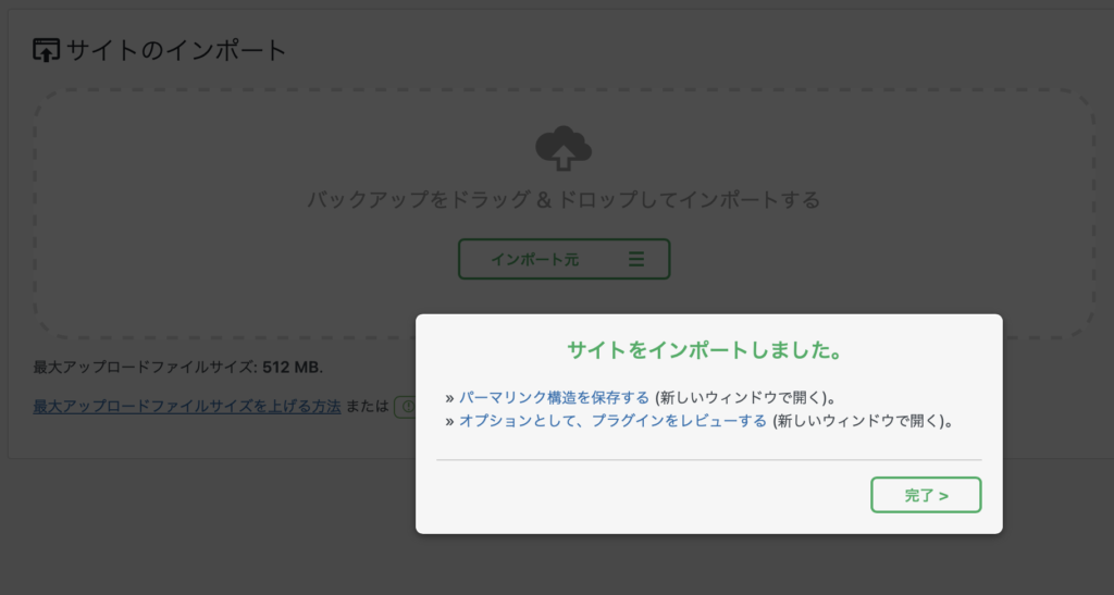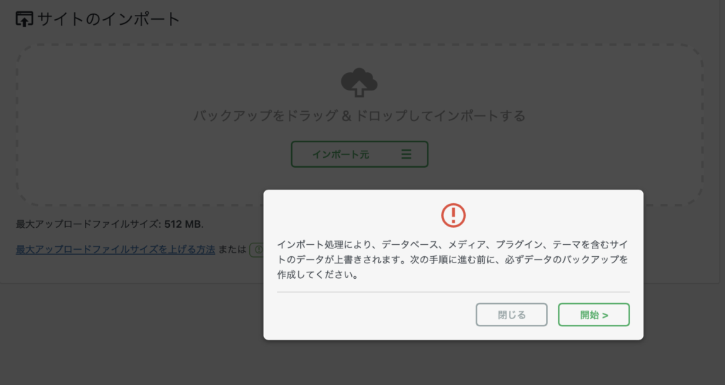 「All-in-One WP Migration」のインポートを選択し、ダウンロードしておいた「.wpress」ファイルを選択します。すると、すぐにインポートが開始されます。