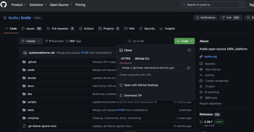 print(arelle.__file__)場所がわかったら、Arelleのファイルが公開されているGitHubに行き、「Code」をクリックし、「Download ZIP」をクリックします。ファイルがダウンロードできます。